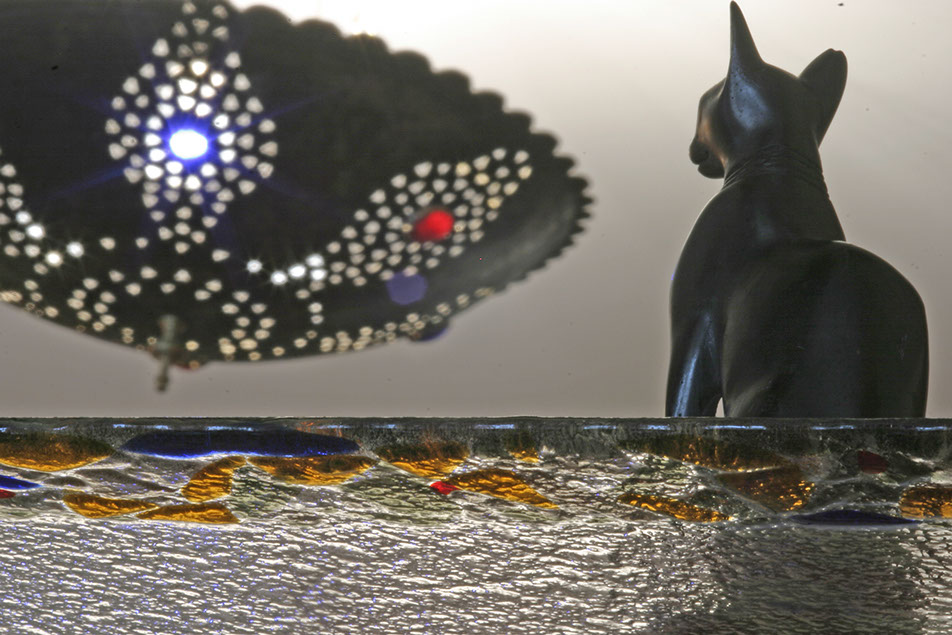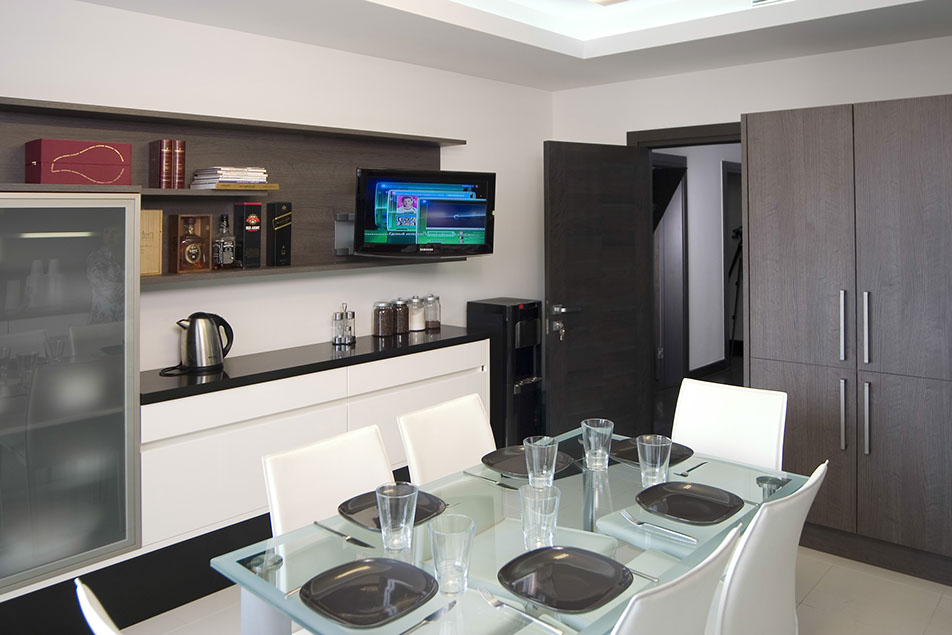 Зонирование общественной части квартиры выполняет консоль, которая отделяет гостиную от библиотеки. Телевизор располагается на поворотном механизме, что позволяет смотреть его изо всех зон, в том числе из кухни. Консоль декорирована легкими стеклянными полками с фьюзингом, которые закреплены на кованых элементах.
