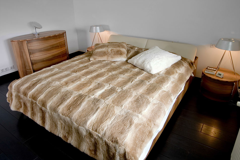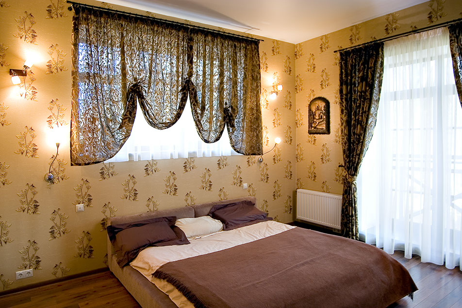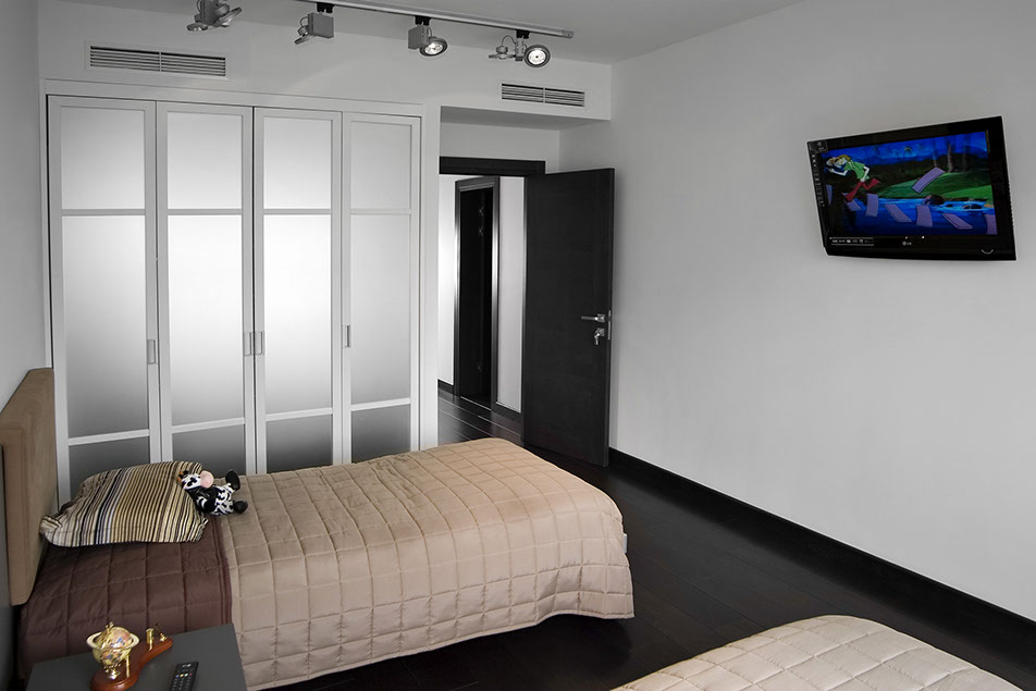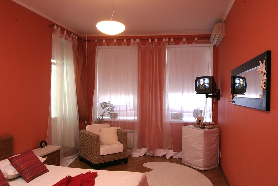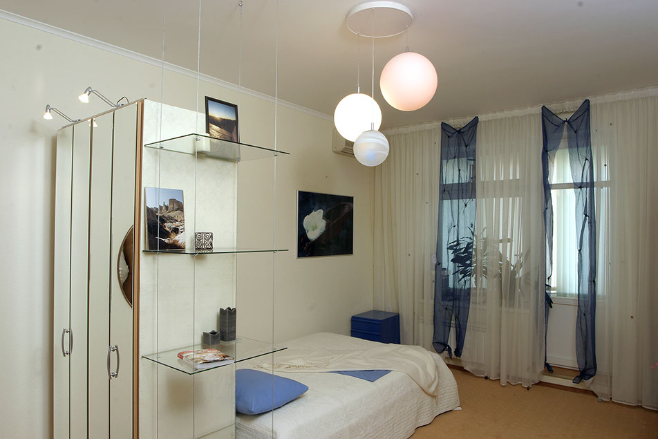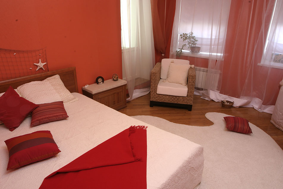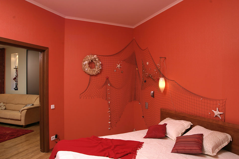 Наиболее необычным помещением квартиры является спальня хозяев. Насыщенная окраска стен создает тепло, а морская тематика в декорировании и шторы-паруса привносят в интерьер веяние морского бриза.