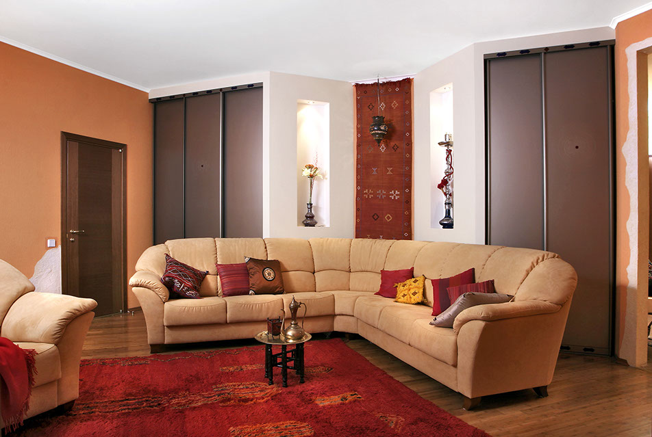 Зона гостиной. На матовые бронзовые двери шкафа нанесен марокканский орнамент. Смотреть телевизор и пить кофе приятно на большом марокканском ковре с длинным ворсом. Композицию дополняют настенное панно ручной работы и национальный светильник.
